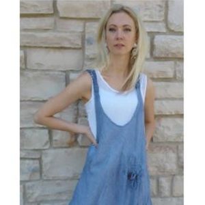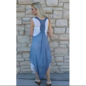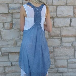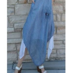 Cotton gauze white under-dress with denim blue overlay dress set. Machine wash, cold water. One Size. Maximum bust: 39"; maximum hip: 44"; length: 44. New with tags.