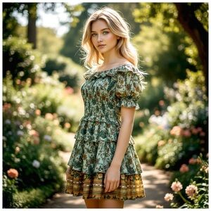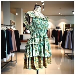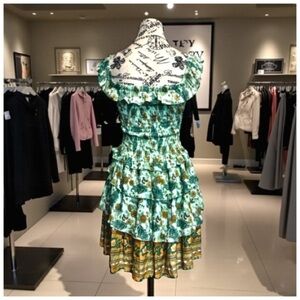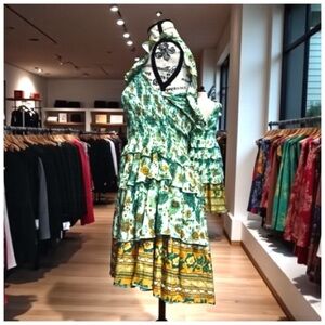 The elastic top blends right into the fun and flirty tiered layers of the skirt and gorgeous lurex stripes accentuate the floral print designed in house.