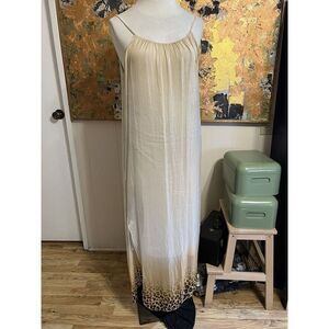 Color: Ombre Beige and Peach with Animal Print hemThe elegant silk fabric and slim fit make this sultry little number the ideal dress for a night out on the town. Featuring subtle animal print detailing and a side slit that allows room for dancing, the Bebe dress may just be your new favorite party dress!- Fully Lined - Dip Dyed Ombre Silk- Hand Painted Animal Print Detailing - Spaghetti Straps - Side Slit in Lining and Overlay