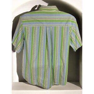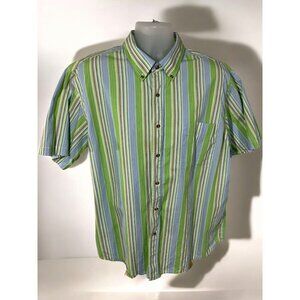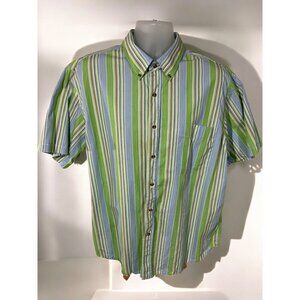 This Scandia Woods shirt features a vibrant green and blue striped pattern, embodying a casual yet polished appeal. Tailored with short sleeves and a button-up design, it offers breathability and comfort. The XL sizing and cotton blend material ensure a relaxed fit for versatile wear.
