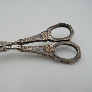 These antique silver pastry tongs feature ornately designed handles and a decorative, pierced serving end. Ideal for elegant serving at formal events. Preowned - 7.5" long