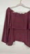 Rich burgundy color (bordeaux) off shoulder top has large elastic band around top to keep it in place. Two tiers of luxurious silk fabric for a full, flowy look. Long sleeves are belled. There are small loops on each sleeve for a string to tie up the sleeves. The strings are missing, but you can easily replace with ribbons or elastic bands.