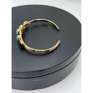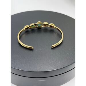This wonderful vintage cuff bracelet features 5 stone scarab beetle cabochons in gold tone metal. Each Scarab is in an open-back bezel setting, allowing the stone to be seen from behind. The little scarabs are hand carved and feature faux hieroglyphs on the backs of the stones. This cute bracelet will make a great addition to any vintage jewelry collection