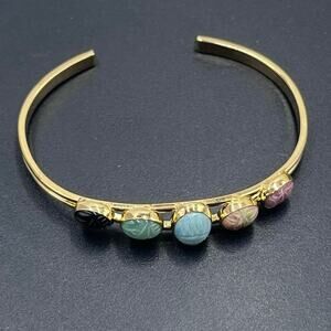 This wonderful vintage cuff bracelet features 5 stone scarab beetle cabochons in gold tone metal. Each Scarab is in an open-back bezel setting, allowing the stone to be seen from behind. The little scarabs are hand carved and feature faux hieroglyphs on the backs of the stones. This cute bracelet will make a great addition to any vintage jewelry collection