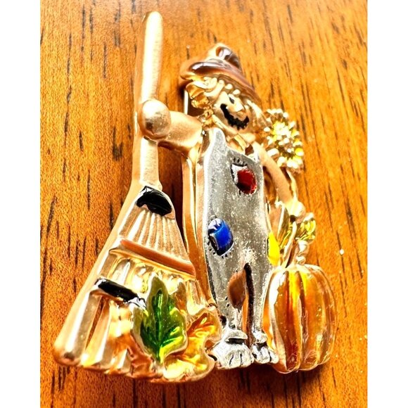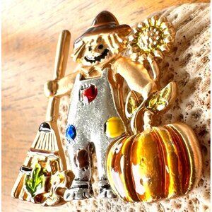 Scarecrow Brooch Pin New Fall Pumpkin Autumn Leaves Rake Sunflower Overalls