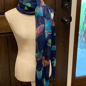 Scarf has navy blue background and butterflies. The butterflies are in various colors purple, orange, yellow, lime, pale pink, blue, green. Butterflies are outlined in a grayish brown.