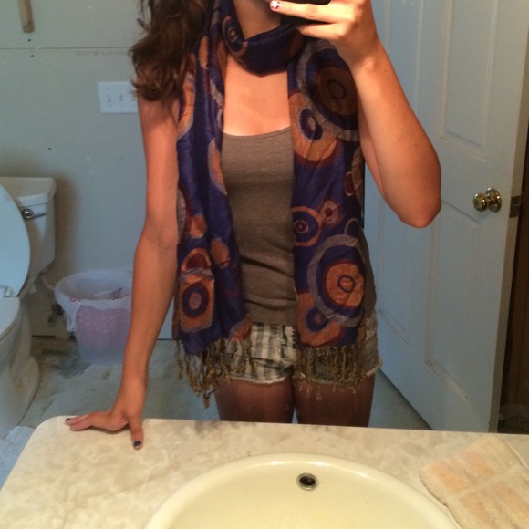 70% Pashima, 30% silk. Double sided tan and deep blue scarf with circles. Great silky feel, very warm yet airy. Can be worn and used for many different things. Very wide, yet easily folded and compressed.