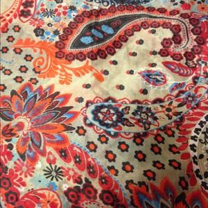 Paisley print scarf. Colors are orange, red, black, blue, and white. Background color is a tan-ish color. Worn a few times. Perfect condition.