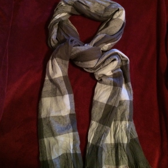 Grey and white plaid scarf. Super soft, fringe on ends, long in length