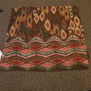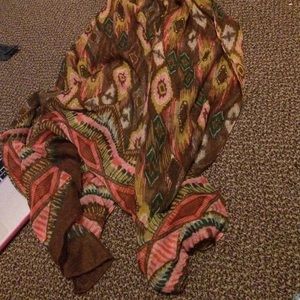Patterned scarf, can be worn all sorts of ways! It's thin so is perfect for layers! Has colors light pink, limes and brown and some others!