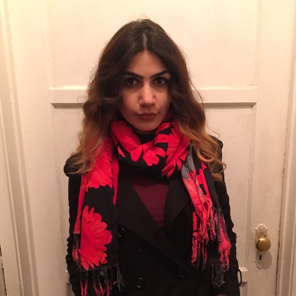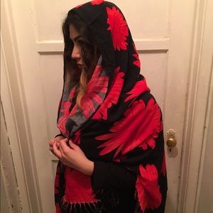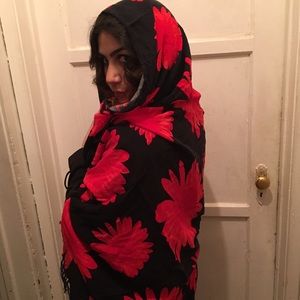 Black scarf with red flower design's. BRAND NEW condition, never been worn.