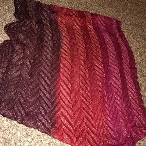 Dark reds and burgundy coloring with gold shimmering through it. It is texturized.