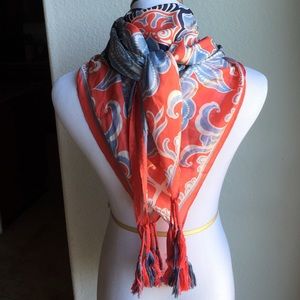 This scarf is so versatile... can be worn in so many different ways as shown in photos. May be used as a scarf or a shawl & even a wrap. Tassels to all four corners. Never worn.