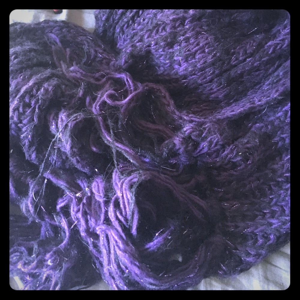 Long, thick, purple and black woven scarf. Glitter threads throughout. Tassels on either ends.