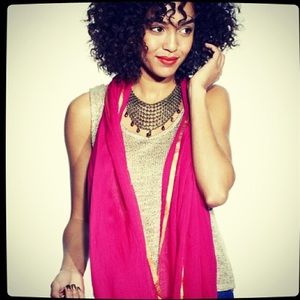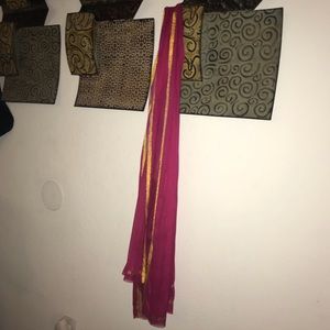 🧣 - magenta with gold trim. It is 77 inches long and 27 inches wide without over stretching. Bottoms have minimal fraying. It is a sheer material. Worn once. Very unique and elegant! Nice piece to add to any closet.