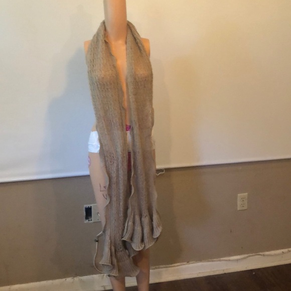 Delicate must have scarf. Notice the ruffle and bell like ends. So cute! 100% acrylic. Dry clean only