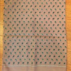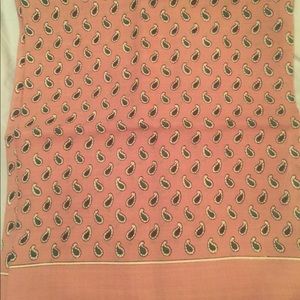 Salmon colored scarf with paisley designs. Measures 60” long by 12”. Tiny fringe on the ends. Sure to blend with many outfits. Brand new without tag.
