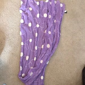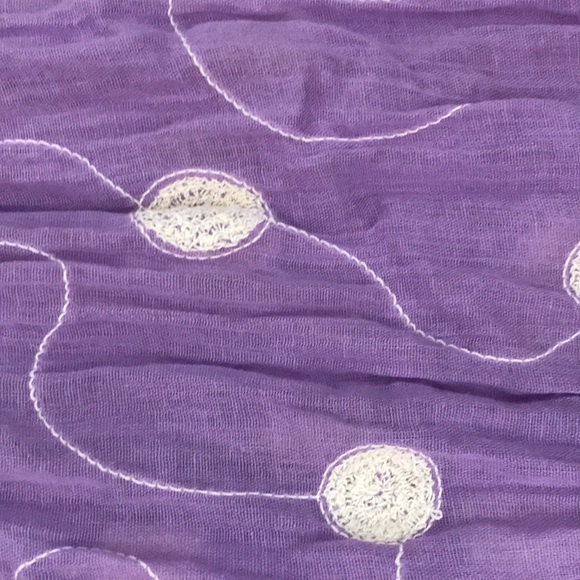Thin purple scarf with embroidered design. About four feet long