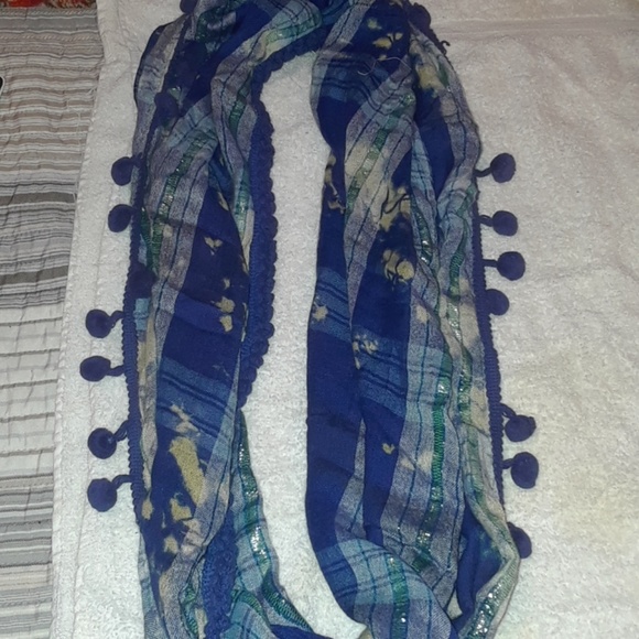 Infinity scarf with white fringe balls.