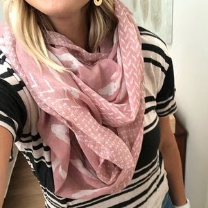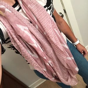 Pink and white patterned fashion scarf. Can be worn long or wrapped around more tightly.
