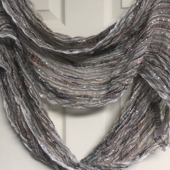 Tan taupe and black lightweight eternity scarf. There is some metallic stitching in it.