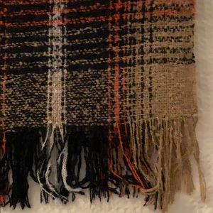 Warm tan and navy scarf with orange and white pattern. Like new condition.