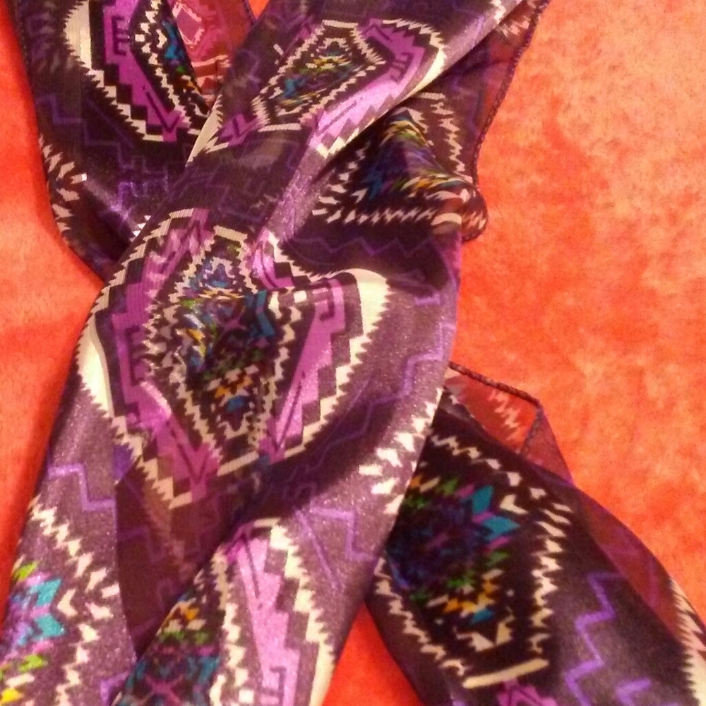 Beautiful light weight scarf. Approximately 54 inches long. Material has a shine to it