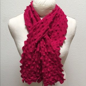 Raspberry pink scarf with beautiful knit texture. Soft and lightweight, can be used year-round. This scarf adds a lot of zest to any outfit.. 8” wide, 42” long.