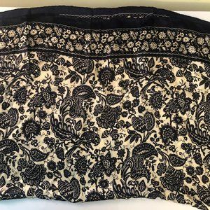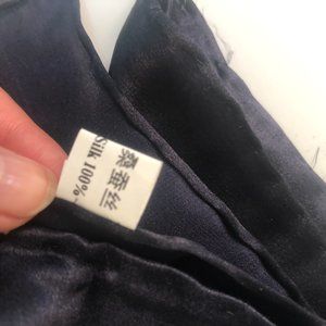 Navy and gold florally patterned scarf, one hundred percent silk material