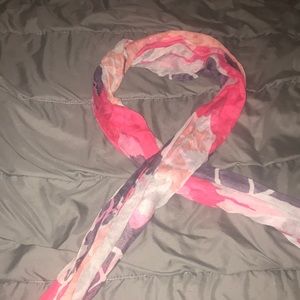 Peace sign & camo scarf that has pink, white, grey,& orange in it.