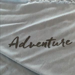 Large baby blue scarf with the word Adventure written across the bottom on one side.