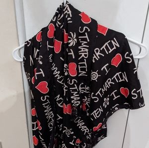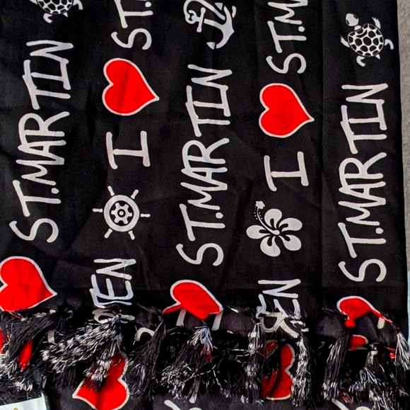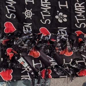 Big black scarf, thin, red hearts, white words
