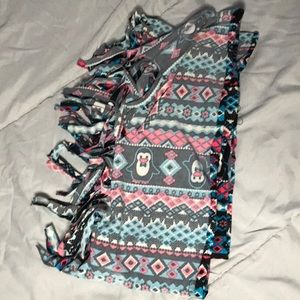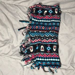 It’s a pink, black, blue, and white scarf with penguins on it!
