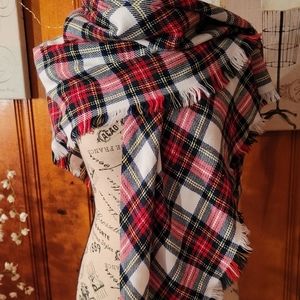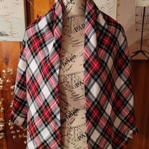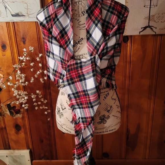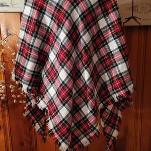 This is a diamond shaped plaid scarf/shawl with fringe. It can be worn many different ways.! No tags, but I believe it is cotton blend, it has red, blue,yellow. NWOT!