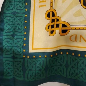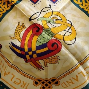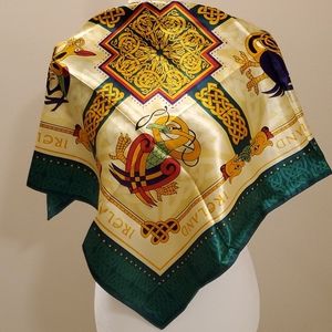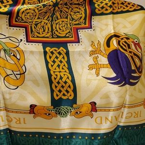 Polyester but very silky scarf. Authentic Irish with Keltic symbols. Rich, bold colors, photos don't do justice. 28"x28"