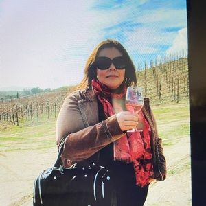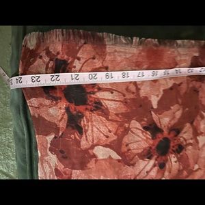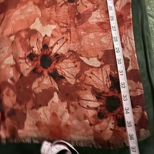 It’s a lightweight scarf. No label. Don’t know the material It’s an orange/reddish color pattern. The measurement on length is with the scarf 🧣folded. The length is taller than me and I’m 5ft 1in 🤷🏻♀️.