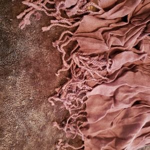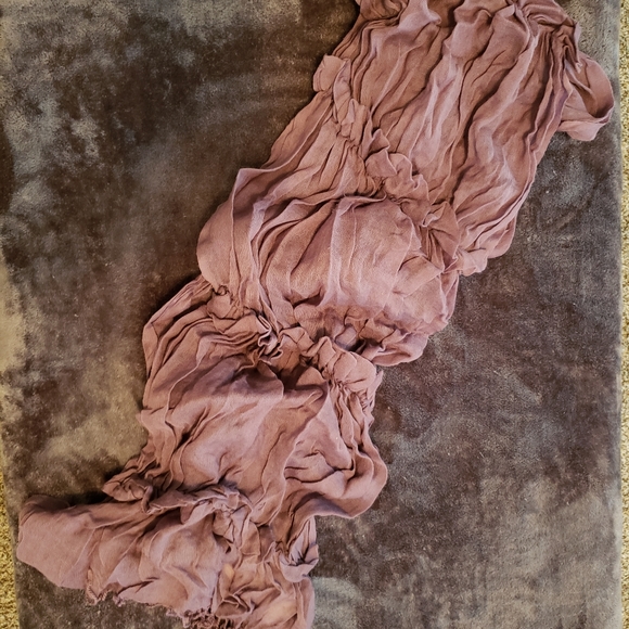 Anthropologie scarf purple with rouching detail and fringe on the end.