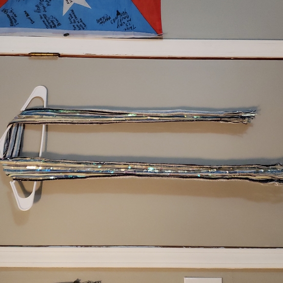 Sequins in shades of blue and tan fringe on ends. Great shape