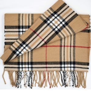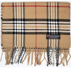 100% Cashmere Scarf. Perfect for Fall and Winter. Classic camel, with white, black, and red stripes. Made in Scotland. Inspired by the famous Scottish clans and their tartans. Great gift for men or women.
