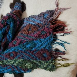Multi color scarf will go with anything! This is a very wide and long scarf but not to thick. It does have a few snags but with all the crinkled material you can barely see them.