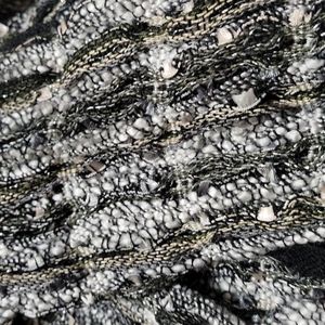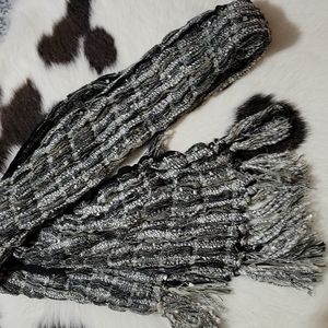 Black and white scarf with accents of tan and silver speckles. Very clean and in good shape. No tag