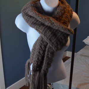 Wore this one twice. Its very nice, plush, warm and beautiful!! Long, lots of ways to wrap it. Hard to explain the color...it is not tan or gray..its a beautiful multi color solid...it has a hint of red, a hint of blue-teal-gray...its cool! Made in Italy.
