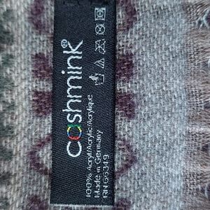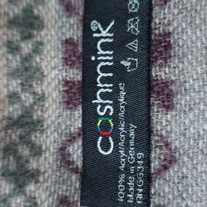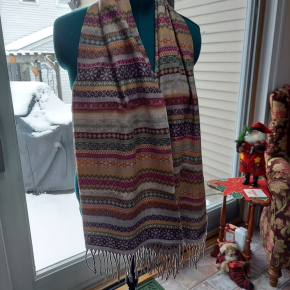 Very soft scarf in earth tones. Snuggle warm. 3 1/2" Tan fringe. Coshmink - 62" long.