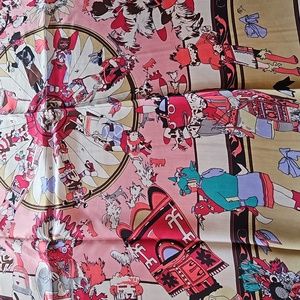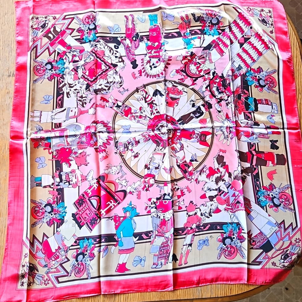 35 inches by 35 inches. 100%silk feeling polyester. pinks, creams, brown, teal.