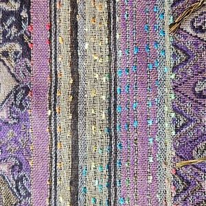 27 inches by 38 inches. soft knit fabric. purples and cream with small spots of different primary colors.