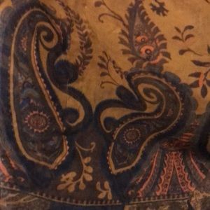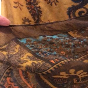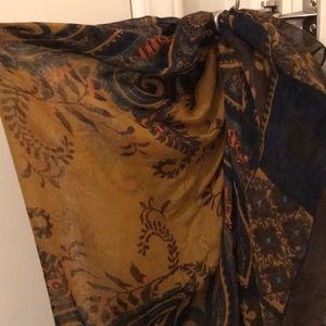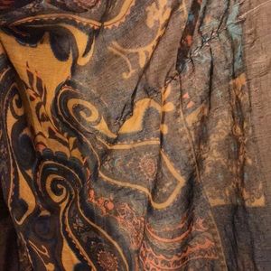 Vibrant colors of gold, turquoise, add so much to the brown and navy blue ‘large’ scarf. Of course it’s a great for your neck, but it has been worn as a shawl. If you are creative this scarf 🧣 is large enough to create yourself a beautiful halter top. So gorgeous for the fall!