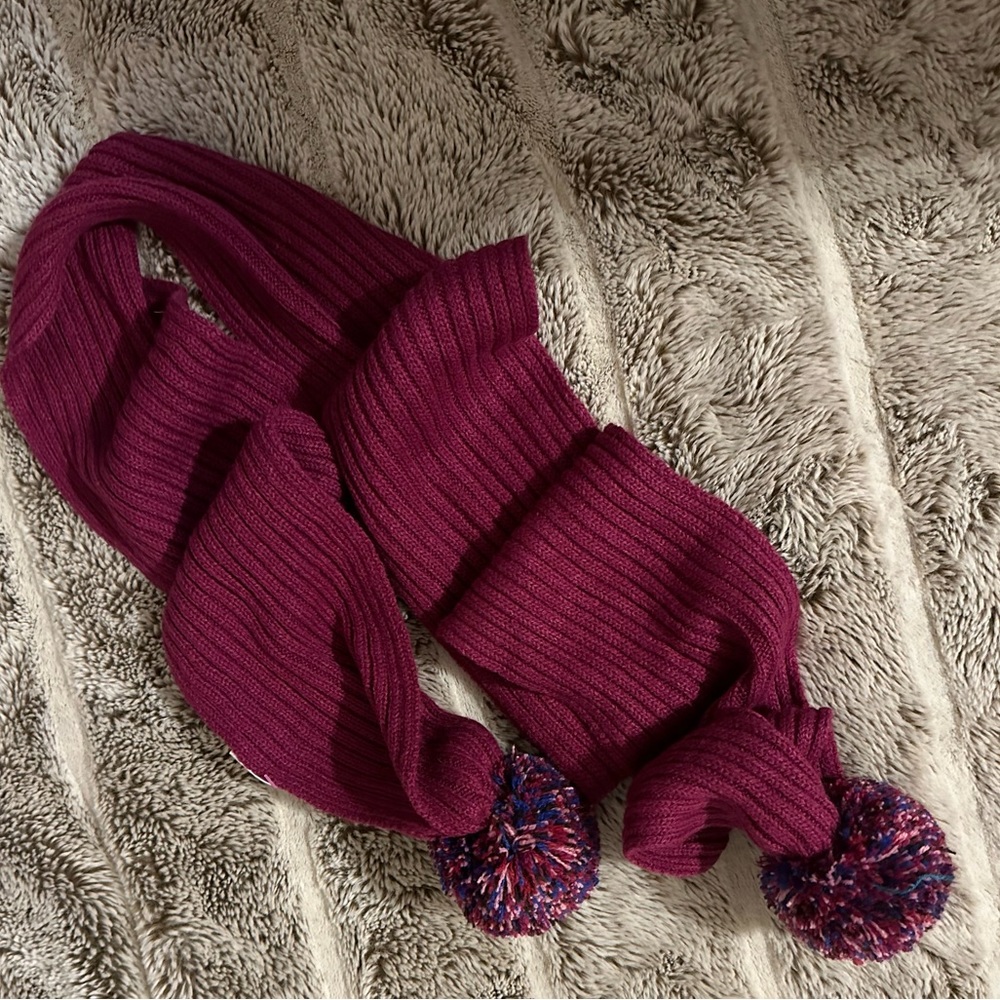 Magenta scarf new with tags featuring multi colored poms. Would be cute for a child or adult.