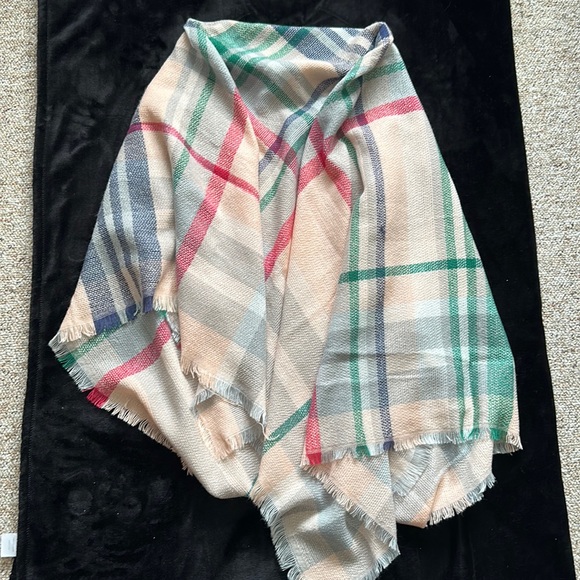 NWOT, blanket scarf, pink, dark pink, green, navy blue, white and light gray plaid pattern