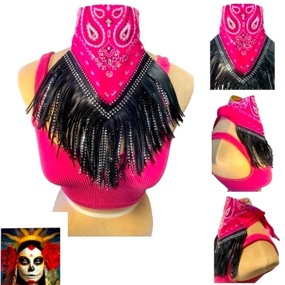 Hot pink bandana scarf with black fringe with bling bling! NEW never worn
