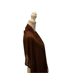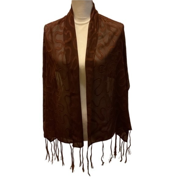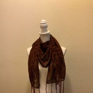 Pre-loved scarf/shawl. Good condition. This scarf is unbranded. This scarf has fringes at the bottom. This scarf can be worn many different ways. Length-60”, width-22 1/2”. No trades. Smoke free and Pet free environment. Thank you!